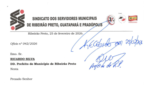 Nesta terça-feira, 25 de fevereiro, a diretoria do Sindicato dos Servidores Municipais esteve na Prefeitura de Ribeirão Preto para protocolar oficialmente a pauta de reivindicações da Campanha Salarial 2026 junto ao prefeito Ricardo Silva.