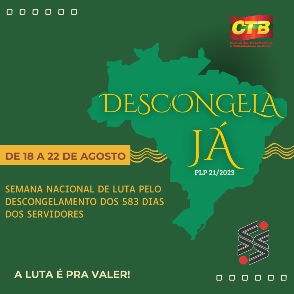 A Central dos Trabalhadores e Trabalhadoras do Brasil (CTB) iniciou nesta segunda-feira (18) uma campanha nacional para cobrar dos deputados federais a aprovação do PLP 21/2023, que visa o descongelamento do tempo de serviço de todos os servidores referente ao período da pandemia (2020-2021), para fins de anuênios, triênios, quinquênios, sexta-parte, licença-prêmio e outras gratificações. A campanha “Descongela Já” vai se estender até a próxima sexta-feira, dia 22.