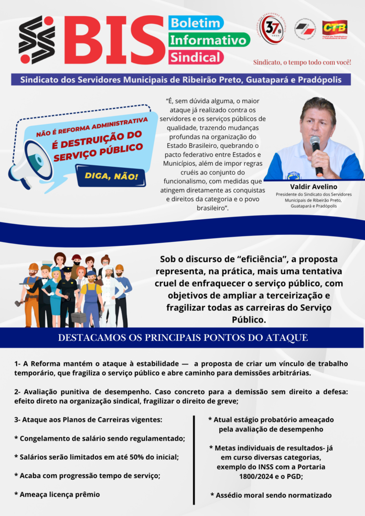 É chegado o momento de unirmos força contra este ataque que pode (caso aprovado) destruir o serviço público de qualidade. E para isso, a direção do Sindicato inicia a divulgação de um Boletim Informativo Sindical (BIS), destacando alguns pontos deste ataque contra os servidores, contra o serviço público e contra o povo brasileiro.