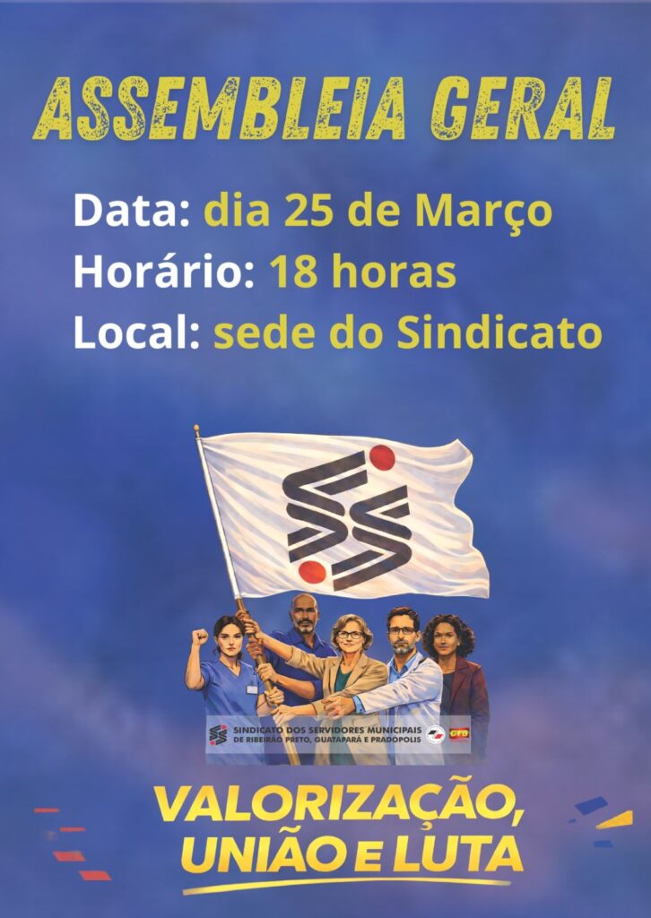 A assembleia geral dos servidores acontece nesta quarta-feira, 25 de março, às 18 horas, na sede do Sindicato.